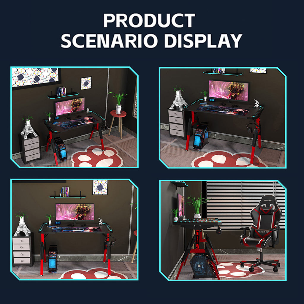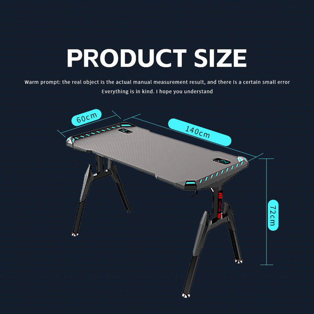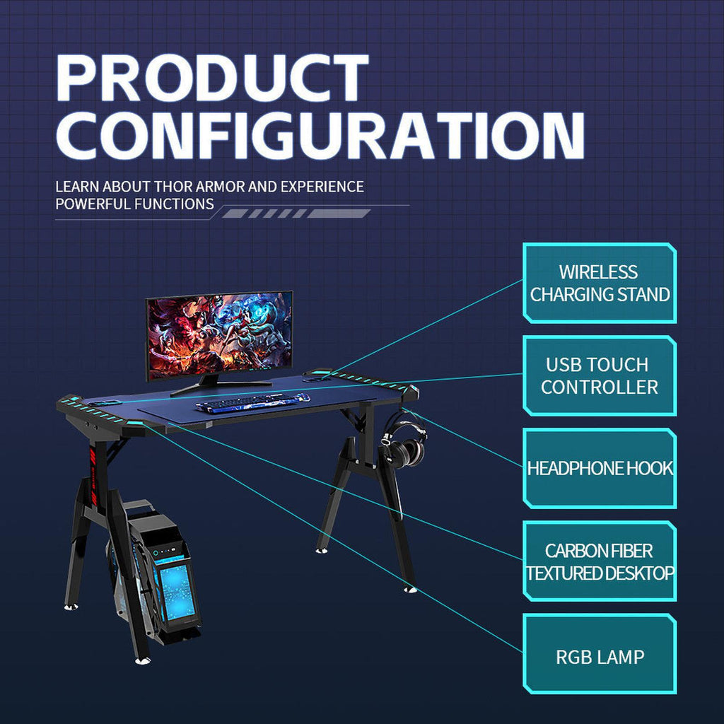 USB powered RGB lights run around the edge of the gaming desk, to get the atmosphere set just right for your next gaming session. Set it the way you like it with adjustable brightness, strobe, colour variation. Together with headphone rack, this is a awesome gaming desk.