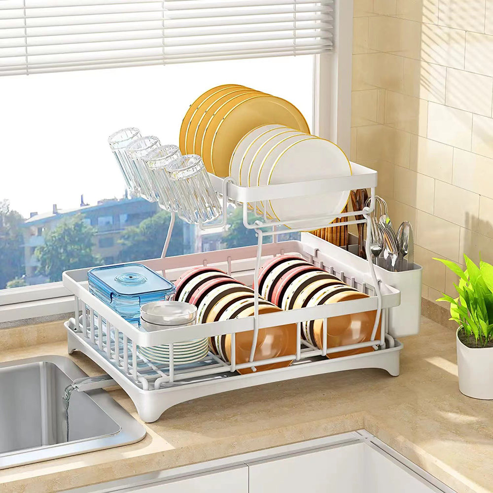 Viviendo 2 Tier Dish Drainer Drying Rack in Carbon Steel with Kitchen Counter Cup and Cutlery Holder - White